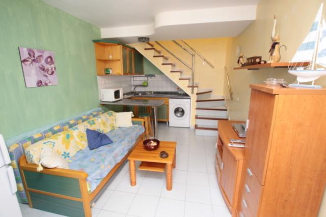 Duplex for rent in Maspalomas (Gran Canaria). 1 bedroom, 1 bathroom, living room, American kitchen, balcony and private terrace. The complex has communal pool.