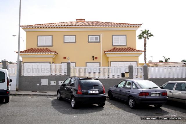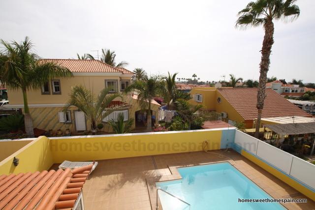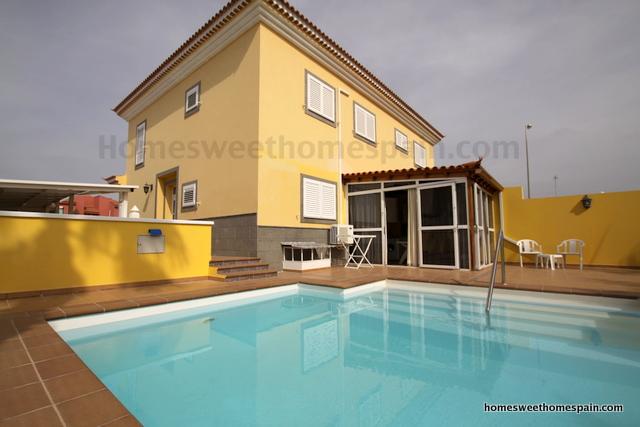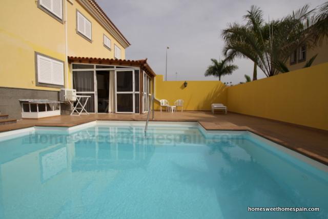 Chalet( semi-detached house) of three floors in Sonneland(Gran Canaria). 5 bedrooms, 4 bathrooms, living / dining room, 2 independent kitchen(one indoor the other outdoor). It has air conditioning everywhere in the house, a very large terrace, big garage for upto 5 cars and private swimming pool.