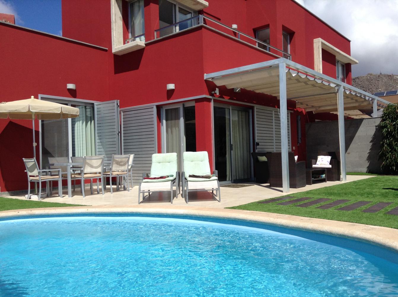 Spectacular villa in one of Gran Canarias most Prestigious areas bordering on the golf course, the villa consists of 2 bedrooms, 2 bathrooms, open planned living / dining room with American kitchen, Amazing garden with a swimming pool.