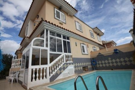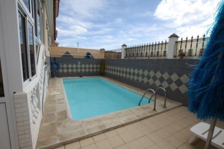 House in Sonneland (Gran Canaria). 5 bedrooms, 3 bathrooms, living / dining room, kitchen and storage room. It has a terrace upstairs, garage, security system and private swimming pool. The house already has internet telephone and satellite TV installed.